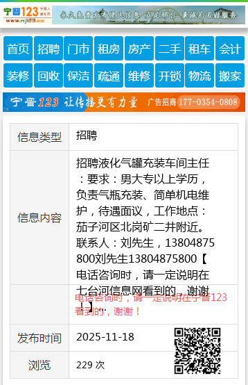 招聘液化气罐充装车间主任:要求:男大专以上学历,负责气瓶充装、简单机电维护,待遇面议,工作地点:茄子河区北岗矿二井附近。联系人:刘先生,13804875800刘先生13804875800 【电话咨询时,请一定说明在七台河信息网看到的,谢谢!】 |