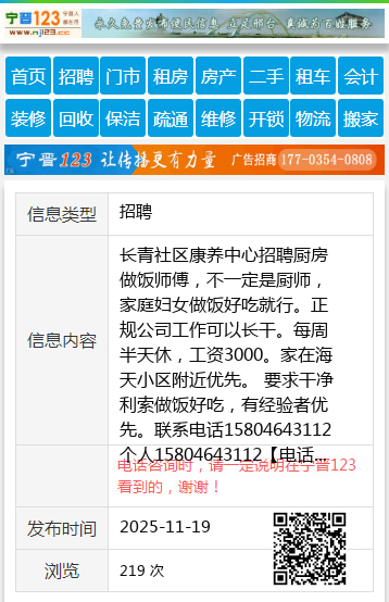 长青社区康养中心招聘厨房做饭师傅,不一定是厨师,家庭妇女做饭好吃就行。正规公司工作可以长干。每周半天休,工资3000。家在海天小区附近优先。 要求干净利索做饭好吃,有经验者优先。联系电话15804643112个人15804643112 【电话咨询时,请一定说明在七台河信息网看到的,谢谢!】 |