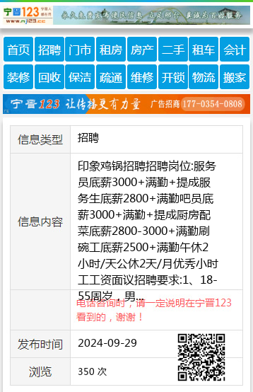 印象鸡锅招聘招聘岗位:服务员底薪3000+满勤+提成服务生底薪2800+满勤吧员底薪3000+满勤+提成厨房配菜底薪2800-3000+满勤刷碗工底薪2500+满勤午休2小时/天公休2天/月优秀小时工工资面议招聘要求:1、18-55周岁,男女不限身体健康,无不良嗜好。2、经验不限,学历不限,正直诚信、服从管理。联系电话:15846196613蔡15846196613 【电话咨询时,请一定说明在七台河信息网看到的,谢谢!】 |
