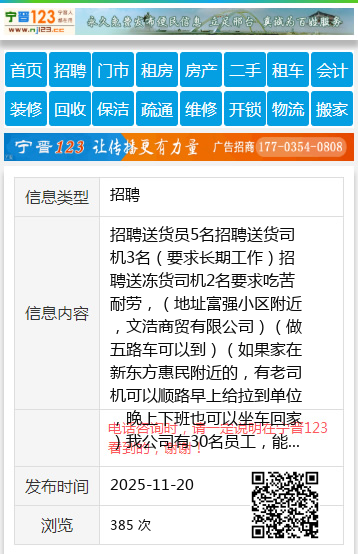 招聘送货员5名招聘送货司机3名(要求长期工作)招聘送冻货司机2名要求吃苦耐劳,(地址富强小区附近,文浩商贸有限公司)(做五路车可以到)(如果家在新东方惠民附近的,有老司机可以顺路早上给拉到单位,晚上下班也可以坐车回家)我公司有30名员工,能长期工作的,欢迎你的加入电话13199231100个人13199231100 【电话咨询时,请一定说明在七台河信息网看到的,谢谢!】 |