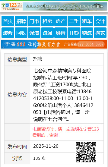 七台河中森精神病专科医院招聘保洁上班时间:早7:30,晚4点半工资1700地址:北山原老技工校联系电话:138464120538:00-11:00 13:00-16:00接听电话个人13846412053 【电话咨询时,请一定说明在七台河信息网看到的,谢谢!】 |