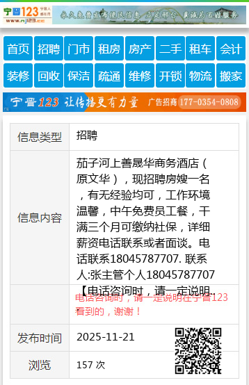茄子河上善晟华商务酒店(原文华),现招聘房嫂一名,有无经验均可,工作环境温馨,中午免费员工餐,干满三个月可缴纳社保,详细薪资电话联系或者面谈。电话联系18045787707. 联系人:张主管个人18045787707 【电话咨询时,请一定说明在七台河信息网看到的,谢谢!】 |