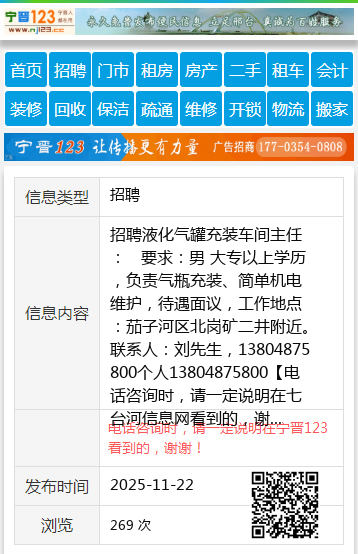 招聘液化气罐充装车间主任: 要求:男 大专以上学历,负责气瓶充装、简单机电维护,待遇面议,工作地点:茄子河区北岗矿二井附近。联系人:刘先生,13804875800个人13804875800 【电话咨询时,请一定说明在七台河信息网看到的,谢谢!】 |