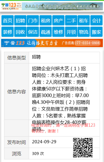 招聘企业兴妍木艺(1)招聘岗位:木头打磨工人招聘人数:2人岗位要求:男身体健康50岁以下薪资待遇:底薪3000上班时间:早7.00晚4.30中午供饭(2)招聘岗位:文员助理工作简单招聘人数:5名要求,熟练掌握电脑表格操作女28-40岁薪资待遇:无责底薪2500加提成月收入5000+上班时间早8.30晚4.30中午供饭。工作地址:英伦小镇微信电话:16744677777刘19104645511 【电话咨询时,请一定说明在七台河信息网看到的,谢谢!】 |