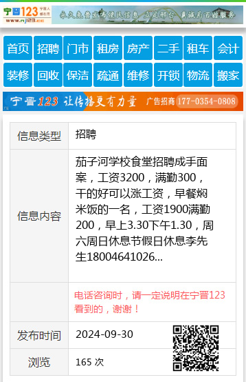 茄子河学校食堂招聘成手面案,工资3200,满勤300,干的好可以涨工资,早餐焖米饭的一名,工资1900满勤200,早上3.30下午1.30,周六周日休息节假日休息李先生18004641026 【电话咨询时,请一定说明在七台河信息网看到的,谢谢!】 |