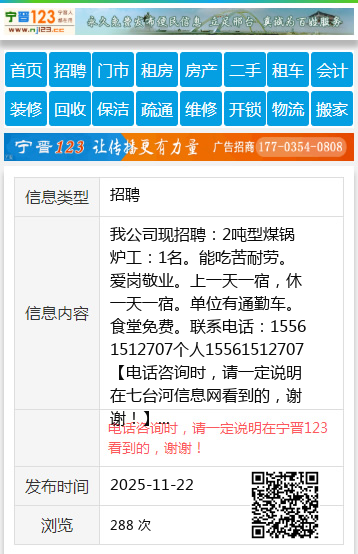 我公司现招聘:2吨型煤锅炉工:1名。能吃苦耐劳。爱岗敬业。上一天一宿,休一天一宿。单位有通勤车。食堂免费。联系电话:15561512707个人15561512707 【电话咨询时,请一定说明在七台河信息网看到的,谢谢!】 |