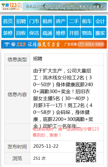 由于扩大生产,公司大量招工:流水线女分捡工2名(30一50岁)身体健康底薪2400+满勤300+奖金!招旧衣服女主播5名(30一40岁)月薪3千一1万!男工2名(40一58岁)会码垛,身体健康,底薪2200+300满勤+奖金)司炉工一名年年龄不限,身体健康,早5点一8点烧锅炉!工资1000元公司晋升空间大,车间主任,厂长一职等你来,只要你有能力,利丰公司永远给你施展的空间!选择利丰,让你富贵一生!!试用期3天。额满为止!早7:30一16:30中午管饭!厂址:新兴区宝泰隆路26号。公交路线:坐(走葫芦头沟的)1路公交车到(家居广场)站点前走100米恒阳科技公司红大门院内。☎️13946506087个人13946506087 【电话咨询时,请一定说明在七台河信息网看到的,谢谢!】 |