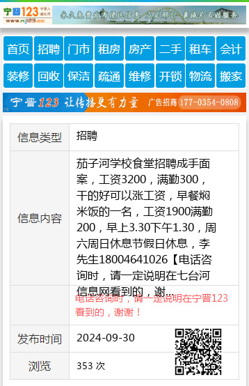 茄子河学校食堂招聘成手面案,工资3200,满勤300,干的好可以涨工资,早餐焖米饭的一名,工资1900满勤200,早上3.30下午1.30,周六周日休息节假日休息,李先生18004641026 【电话咨询时,请一定说明在七台河信息网看到的,谢谢!】 |