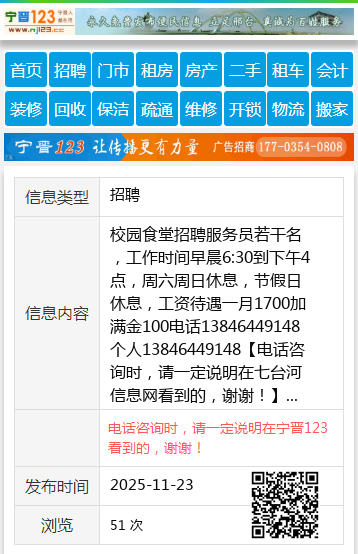 校园食堂招聘服务员若干名,工作时间早晨6:30到下午4点,周六周日休息,节假日休息,工资待遇一月1700加满金100电话13846449148个人13846449148 【电话咨询时,请一定说明在七台河信息网看到的,谢谢!】 |