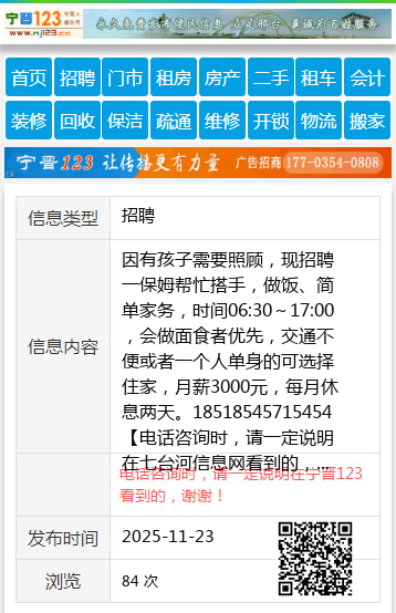因有孩子需要照顾,现招聘一保姆帮忙搭手,做饭、简单家务,时间06:30~17:00,会做面食者优先,交通不便或者一个人单身的可选择住家,月薪3000元,每月休息两天。18518545715454 【电话咨询时,请一定说明在七台河信息网看到的,谢谢!】 |