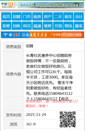 长青社区康养中心招聘厨房做饭师傅,不一定是厨师,家庭妇女做饭好吃就行。正规公司工作可以长干。每周半天休,工资3000。家在海天小区附近优先。 要求干净利索做饭好吃,有经验者优先。联系电话15804643112个人15804643112 【电话咨询时,请一定说明在七台河信息网看到的,谢谢!】 |