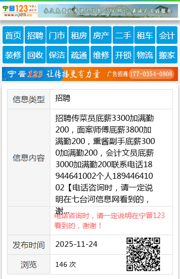 招聘传菜员底薪3300加满勤200,面案师傅底薪3800加满勤200,熏酱副手底薪3000加满勤200,会计文员底薪3000加满勤200联系电话18944641002个人18944641002 【电话咨询时,请一定说明在七台河信息网看到的,谢谢!】 |