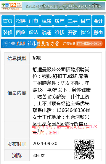 舒适曼服装公司招聘招聘岗位:锁眼.钉扣工.缝纫.零活工招聘条件:男女不限,年龄18~40岁以下,身体健康,吃苦耐劳薪资:计件工资,上不封顶有经验宝妈优先联系电话:13664648336崔女士工作地址:七台河新兴区七星花园A区步行街崔女士13664648336 【电话咨询时,请一定说明在七台河信息网看到的,谢谢!】 |