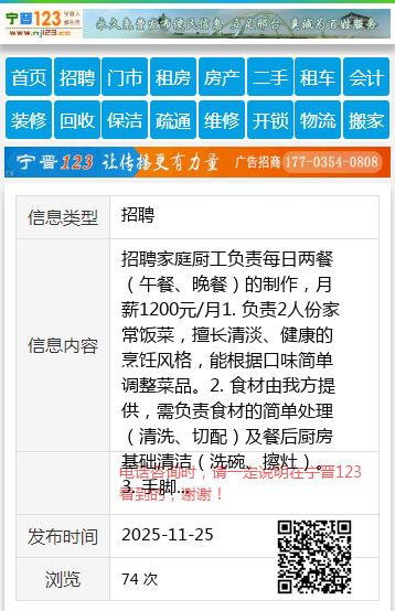 招聘家庭厨工负责每日两餐(午餐、晚餐)的制作,月薪1200元/月1. 负责2人份家常饭菜,擅长清淡、健康的烹饪风格,能根据口味简单调整菜品。2. 食材由我方提供,需负责食材的简单处理(清洗、切配)及餐后厨房基础清洁(洗碗、擦灶)。3. 手脚麻利、讲卫生,有1年以上家庭做饭经验优先,能长期稳定工作。4. 工作时间灵活,可协商确定具体做饭时段(需保证两餐按时供应)有意者请联系:13351141133(电话/微信)个人13351141133 【电话咨询时,请一定说明在七台河信息网看到的,谢谢!】 |