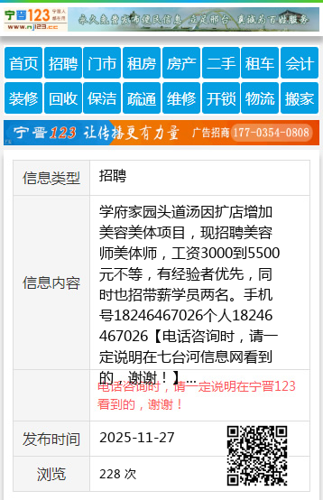 学府家园头道汤因扩店增加美容美体项目,现招聘美容师美体师,工资3000到5500元不等,有经验者优先,同时也招带薪学员两名。手机号18246467026个人18246467026 【电话咨询时,请一定说明在七台河信息网看到的,谢谢!】 |