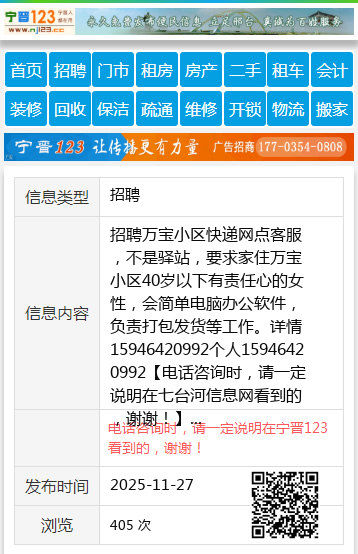 招聘万宝小区快递网点客服,不是驿站,要求家住万宝小区40岁以下有责任心的女性,会简单电脑办公软件,负责打包发货等工作。详情15946420992个人15946420992 【电话咨询时,请一定说明在七台河信息网看到的,谢谢!】 |