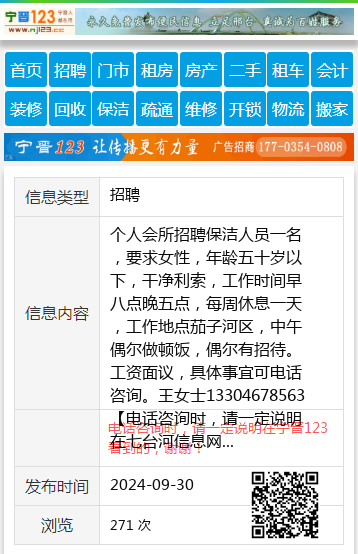 个人会所招聘保洁人员一名,要求女性,年龄五十岁以下,干净利索,工作时间早八点晚五点,每周休息一天,工作地点茄子河区,中午偶尔做顿饭,偶尔有招待。工资面议,具体事宜可电话咨询。王女士13304678563 【电话咨询时,请一定说明在七台河信息网看到的,谢谢!】 |