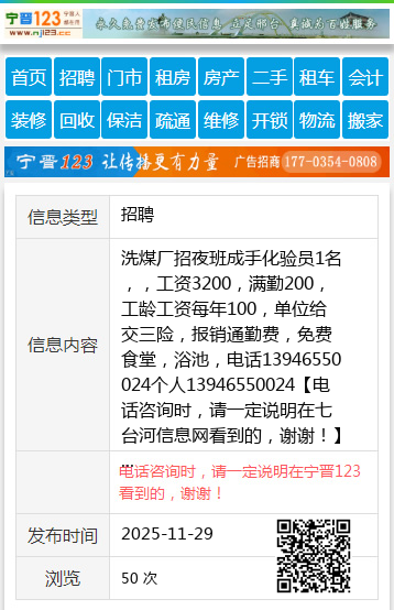 洗煤厂招夜班成手化验员1名,,工资3200,满勤200,工龄工资每年100,单位给交三险,报销通勤费,免费食堂,浴池,电话13946550024个人13946550024 【电话咨询时,请一定说明在七台河信息网看到的,谢谢!】 |