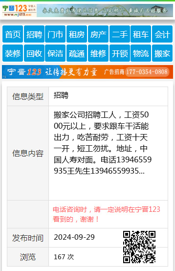 搬家公司招聘工人,工资5000元以上,要求跟车干活能出力,吃苦耐劳,工资十天一开,短工勿扰。地址,中国人寿对面。电话13946559935王先生13946559935 【电话咨询时,请一定说明在七台河信息网看到的,谢谢!】 |