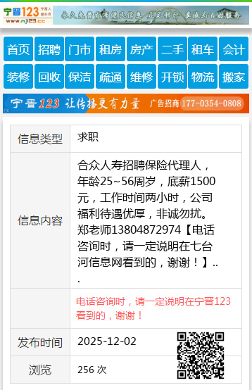 合众人寿招聘保险代理人,年龄25~56周岁,底薪1500元,工作时间两小时,公司福利待遇优厚,非诚勿扰。郑老师13804872974 【电话咨询时,请一定说明在七台河信息网看到的,谢谢!】 |