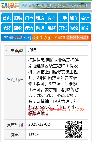招聘信息:因扩大业务现招聘家电维修安装工程师:1.洗衣机、冰箱上门维修安装工程师。2.烟灶厨热系列安装维修工程师。3.空调上门维修工程师。要求如下:能吃苦耐劳,诚实守信,心态积极,有团队精神,服从管理,年龄20岁-55岁,有相关行业经验者优先上岗,并且年龄可以适当放宽。工作性质:上门服务,需自备车辆及工具。薪资待遇在行业内同等规模比例高,单量稳定,计件工资,多劳多得。有意者速来,择优录取,招满为止。联系人:14745671010个人14745671010 【电话咨询时,请一定说明在七台河信息网看到的,谢谢!】 |
