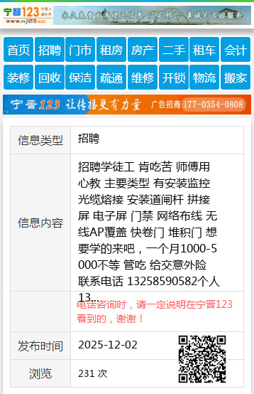 招聘学徒工 肯吃苦 师傅用心教 主要类型 有安装监控 光缆熔接 安装道闸杆 拼接屏 电子屏 门禁 网络布线 无线AP覆盖 快卷门 堆积门 想要学的来吧,一个月1000-5000不等 管吃 给交意外险 联系电话 13258590582个人13258590582 【电话咨询时,请一定说明在七台河信息网看到的,谢谢!】 |