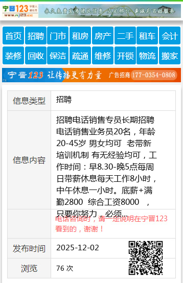 招聘电话销售专员长期招聘电话销售业务员20名,年龄20-45岁 男女均可 老带新培训机制 有无经验均可,工作时间:早8.30-晚5点每周日带薪休息每天工作8小时,中午休息一小时。底薪+满勤2800 综合工资8000 ,只要你努力,必须有回报。工作地址 :北岸5号道 联系人:崔女士(阳阳)电 话:18346494669个人18346494669 【电话咨询时,请一定说明在七台河信息网看到的,谢谢!】 |