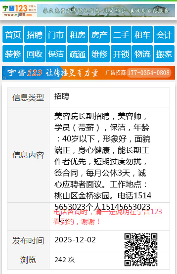 美容院长期招聘,美容师,学员(带薪),保洁,年龄:40岁以下,形象好,面貌端正,身心健康,能长期工作者优先,短期过度勿扰,签合同,每月公休3天,诚心应聘者面议。工作地点:桃山区金桥家园。电话15145653023个人15145653023 【电话咨询时,请一定说明在七台河信息网看到的,谢谢!】 |
