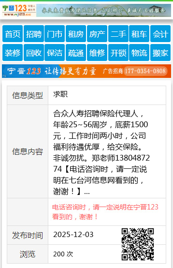 合众人寿招聘保险代理人,年龄25~56周岁,底薪1500元,工作时间两小时,公司福利待遇优厚,给交保险。非诚勿扰。郑老师1380487274 【电话咨询时,请一定说明在七台河信息网看到的,谢谢!】 |
