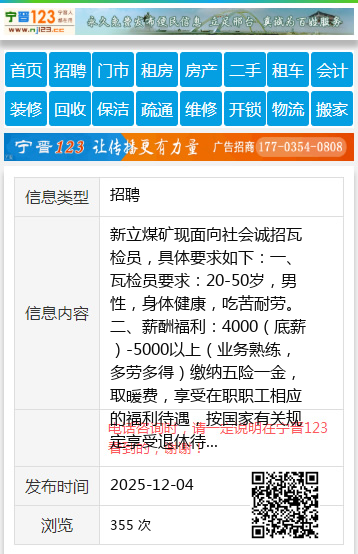 新立煤矿现面向社会诚招瓦检员,具体要求如下:一、瓦检员要求:20-50岁,男性,身体健康,吃苦耐劳。二、薪酬福利:4000(底薪)-5000以上(业务熟练,多劳多得)缴纳五险一金,取暖费,享受在职职工相应的福利待遇,按国家有关规定享受退休待遇。工作制:上一宿歇两天一宿北山,七星花园,北岸,新立煤矿是您很好的选择。私企频繁放假,别在浪费时间了,国企稳定,年纪大了,有个保障。电话(微信同步):许立东13946548503联系时间:早六点~早八点,下午两点~晚八点个人13946548503 【电话咨询时,请一定说明在七台河信息网看到的,谢谢!】 |