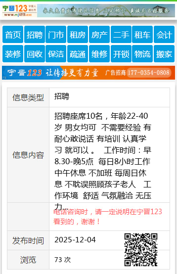 招聘座席10名,年龄22-40岁 男女均可 不需要经验 有耐心敢说话 有培训 认真学习 就可以 。 工作时间:早8.30-晚5点 每日8小时工作 中午休息 不加班 每周日休息 不耽误照顾孩子老人 工作环境 舒适 气氛融洽 无压力 新人小白 底薪2600➕200满勤➕提成 头一个月3-4千 二个月 5-7千 3个月后7-1万 每月15日准时发工资 不拖不压 来吧 努力就有回报 给彼此一个相识的机会 。地址:七台河 桃山区 新兴区 勃利县 均可 就近上班电话微信:18904645551个人18904645551 【电话咨询时,请一定说明在七台河信息网看到的,谢谢!】 |