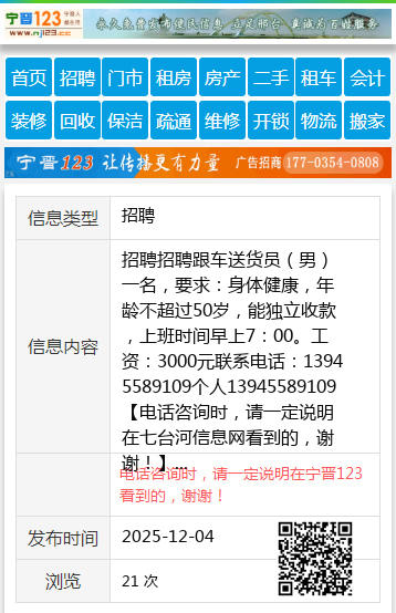 招聘招聘跟车送货员(男)一名,要求:身体健康,年龄不超过50岁,能独立收款,上班时间早上7:00。工资:3000元联系电话:13945589109个人13945589109 【电话咨询时,请一定说明在七台河信息网看到的,谢谢!】 |