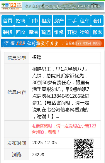 招聘男工,早1点半到八九点钟,总院附近家近优先,30到50岁有责任心,眼里有活手高眼勿扰,早9点前晚7点后勿扰13846491266微同步11 【电话咨询时,请一定说明在七台河信息网看到的,谢谢!】 |