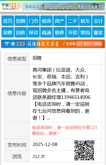 昌河集团(比亚迪、大众、长安、奇瑞、本田、吉利)等多个品牌汽车销售4S店,现招聘多名主播,有意者电话联系颜经理13946514006 【电话咨询时,请一定说明在七台河信息网看到的,谢谢!】 |
