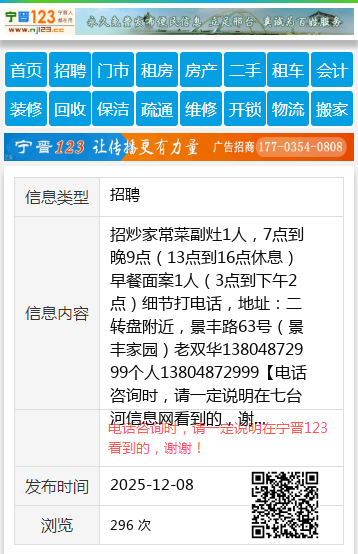 招炒家常菜副灶1人,7点到晚9点(13点到16点休息)早餐面案1人(3点到下午2点)细节打电话,地址:二转盘附近,景丰路63号(景丰家园)老双华13804872999个人13804872999 【电话咨询时,请一定说明在七台河信息网看到的,谢谢!】 |