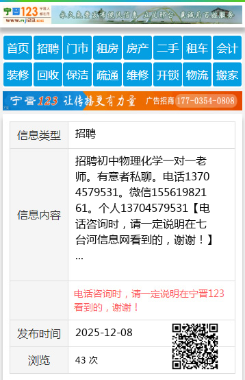 招聘初中物理化学一对一老师。有意者私聊。电话13704579531。微信15561982161。个人13704579531 【电话咨询时,请一定说明在七台河信息网看到的,谢谢!】 |