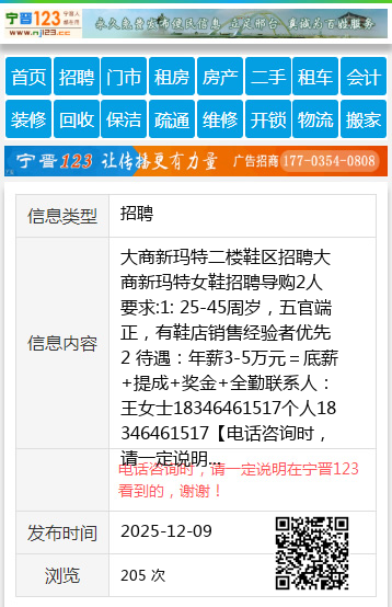 大商新玛特二楼鞋区招聘大商新玛特女鞋招聘导购2人要求:1: 25-45周岁,五官端正,有鞋店销售经验者优先2 待遇:年薪3-5万元=底薪+提成+奖金+全勤联系人:王女士18346461517个人18346461517 【电话咨询时,请一定说明在七台河信息网看到的,谢谢!】 |
