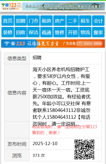海天小区养老机构招聘护工,要求58岁以内女性,有爱心,有耐心。工作时间:上一天一宿休一天一宿。工资底薪2500加效益。有经验者优先。年龄小可以交社保 有意者联系15804643112非诚勿扰个人15804643112 【电话咨询时,请一定说明在七台河信息网看到的,谢谢!】 |