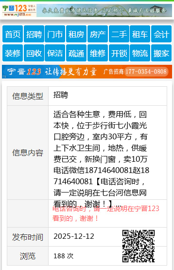 适合各种生意,费用低,回本快,位于步行街七小霞光口腔旁边,室内30平方,有上下水卫生间,地热,供暖费已交,新换门窗,卖10万电话微信18714640081赵18714640081 【电话咨询时,请一定说明在七台河信息网看到的,谢谢!】 |