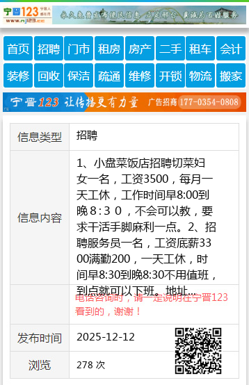 1、小盘菜饭店招聘切菜妇女一名,工资3500,每月一天工休,工作时间早8:00到晚8:30,不会可以教,要求干活手脚麻利一点。2、招聘服务员一名,工资底薪3300满勤200,一天工休,时间早8:30到晚8:30不用值班,到点就可以下班。地址:七号公馆,电话15145698823李15145698823 【电话咨询时,请一定说明在七台河信息网看到的,谢谢!】 |