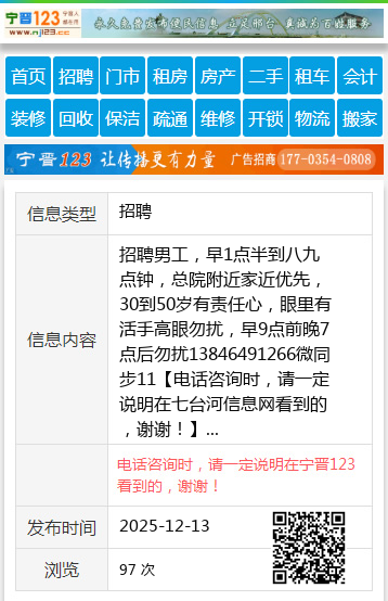 招聘男工,早1点半到八九点钟,总院附近家近优先,30到50岁有责任心,眼里有活手高眼勿扰,早9点前晚7点后勿扰13846491266微同步11 【电话咨询时,请一定说明在七台河信息网看到的,谢谢!】 |