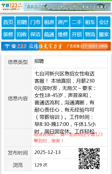 七台河新兴区急招女性电话客服! 本地直招,月薪2300元按时发,无拖欠~要求:女性18-45岁,声音亲和,普通话流利,沟通清晰,有耐心责任心,有无经验均可(带薪培训)。工作时间:早8:30-晚17:00,午休1.5小时,周日固定休。工作轻松无销售压力,办公环境舒适。联系人:X经理,电话13946535559微信同号),有意速联预约面试!个人13946535559 【电话咨询时,请一定说明在七台河信息网看到的,谢谢!】 |