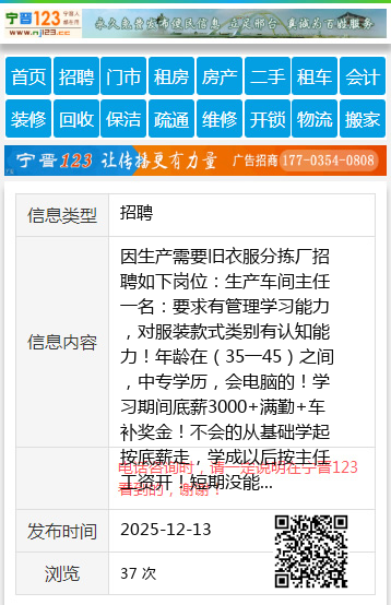 因生产需要旧衣服分拣厂招聘如下岗位:生产车间主任一名:要求有管理学习能力,对服装款式类别有认知能力!年龄在(35一45)之间,中专学历,会电脑的!学习期间底薪3000+满勤+车补奖金!不会的从基础学起按底薪走,学成以后按主任工资开!短期没能力不能吃苦的勿扰!招旧衣服分拣女工若干名,(30一50岁)身体健康底薪2400+满勤300+奖金!以上工种只招长期工!短工勿扰!招旧衣服女主播5名(30一40岁)月薪3千一1万!公司晋升空间大,车间主任,厂长一职等你来,只要你有能力,利丰公司永远给你施展的空间!选择利丰,让你富贵一生!!试用期3天。额满为止!早7:30一16:30中午管饭!厂址:新兴区宝泰隆路26号。公交路线:坐(走葫芦头沟的)1路公交车到(家居广场)站点前走100米恒阳科技公司红大门院内。☎️13946506087个人13946506087 【电话咨询时,请一定说明在七台河信息网看到的,谢谢!】 |