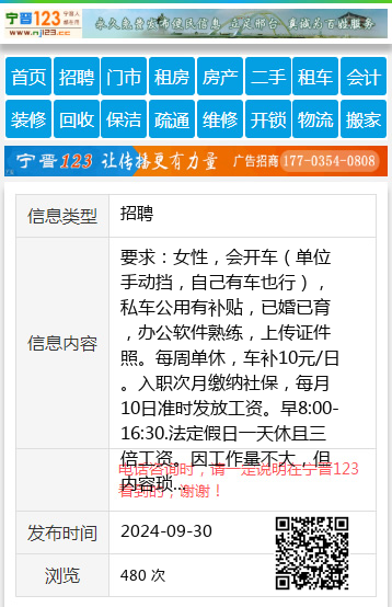 要求:女性,会开车(单位手动挡,自己有车也行),私车公用有补贴,已婚已育,办公软件熟练,上传证件照。每周单休,车补10元/日。入职次月缴纳社保,每月10日准时发放工资。早8:00-16:30.法定假日一天休且三倍工资。因工作量不大,但内容琐碎,所以要求入职人员心细缜密,有责任心且不娇气,服从分配。刚入职综合工资3000+,工资根据能力定且有上涨空间。可将简历发至邮箱444212137@qq.com后再面议。企业名称:七台河市沈发新能源有限公司,为我市招商引资企业,且主营我市餐厨垃圾回收处理项目因本人工作忙碌,请不要打电话或加微信。直接将简历发送至邮箱即可。简历可看出人的基本能力。请详细介绍!!!!!王15804648395 【电话咨询时,请一定说明在七台河信息网看到的,谢谢!】 |