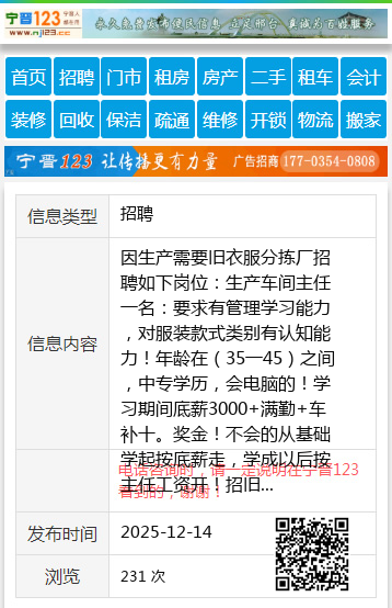 因生产需要旧衣服分拣厂招聘如下岗位:生产车间主任一名:要求有管理学习能力,对服装款式类别有认知能力!年龄在(35一45)之间,中专学历,会电脑的!学习期间底薪3000+满勤+车补十。奖金!不会的从基础学起按底薪走,学成以后按主任工资开!招旧衣服分拣女工若干名,(30一50岁)身体健康底薪2400+满勤300+奖金!以上工种只招长期工!短工勿扰!招旧衣服女主播5名(30一40岁)月薪3千一1万!公司晋升空间大,车间主任,厂长一职等你来,只要你有能力,利丰公司永远给你施展的空间!选择利丰,让你富贵一生!!试用期3天。额满为止!早7:30一16:30中午管饭!厂址:新兴区宝泰隆路26号。公交路线:坐(走葫芦头沟的)1路公交车到(家居广场)站点前走100米恒阳科技公司红大门院内。☎️13946506087个人13946506087 【电话咨询时,请一定说明在七台河信息网看到的,谢谢!】 |