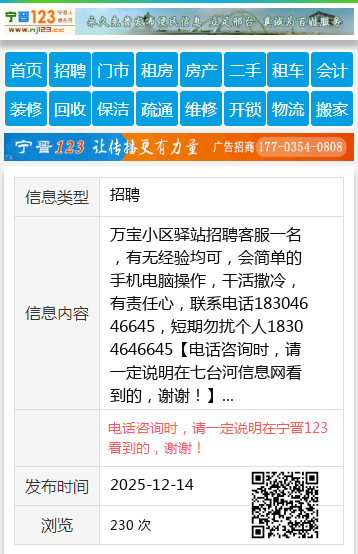 万宝小区驿站招聘客服一名,有无经验均可,会简单的手机电脑操作,干活撒冷,有责任心,联系电话18304646645,短期勿扰个人18304646645 【电话咨询时,请一定说明在七台河信息网看到的,谢谢!】 |