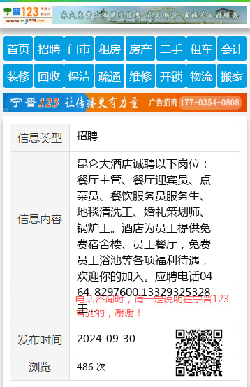 昆仑大酒店诚聘以下岗位:餐厅主管、餐厅迎宾员、点菜员、餐饮服务员服务生、地毯清洗工、婚礼策划师、锅炉工。酒店为员工提供免费宿舍楼、员工餐厅,免费员工浴池等各项福利待遇,欢迎你的加入。应聘电话0464-8297600.13329325328王女士13946555328 【电话咨询时,请一定说明在七台河信息网看到的,谢谢!】 |