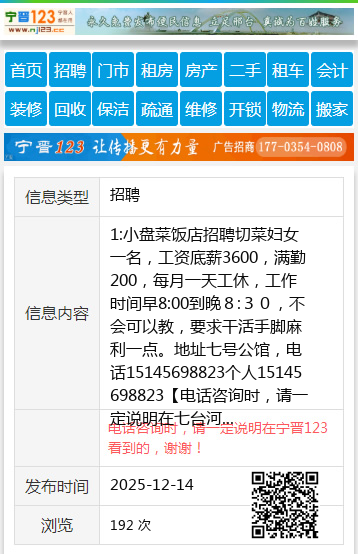1:小盘菜饭店招聘切菜妇女一名,工资底薪3600,满勤200,每月一天工休,工作时间早8:00到晚8:30,不会可以教,要求干活手脚麻利一点。地址七号公馆,电话15145698823个人15145698823 【电话咨询时,请一定说明在七台河信息网看到的,谢谢!】 |