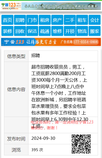 超市招聘收银员员,男工,工资底薪2800满勤200月工资3000每个月一天公休,上班时间早上7点晚上八点中午休息一个小时,工作地址在欧洲新城,另招聘半班蔬菜水果理货员,要求会包菜包水果有多年工作经验!上班时间早上6.30到中午12.30工资1800工作地点在银泉小区王18504645127 【电话咨询时,请一定说明在七台河信息网看到的,谢谢!】 |
