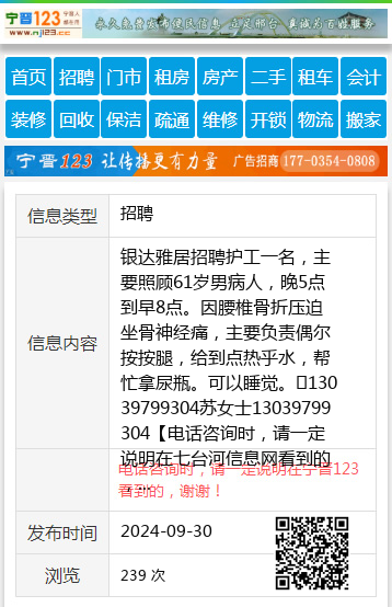 银达雅居招聘护工一名,主要照顾61岁男病人,晚5点到早8点。因腰椎骨折压迫坐骨神经痛,主要负责偶尔按按腿,给到点热乎水,帮忙拿尿瓶。可以睡觉。13039799304苏女士13039799304 【电话咨询时,请一定说明在七台河信息网看到的,谢谢!】 |